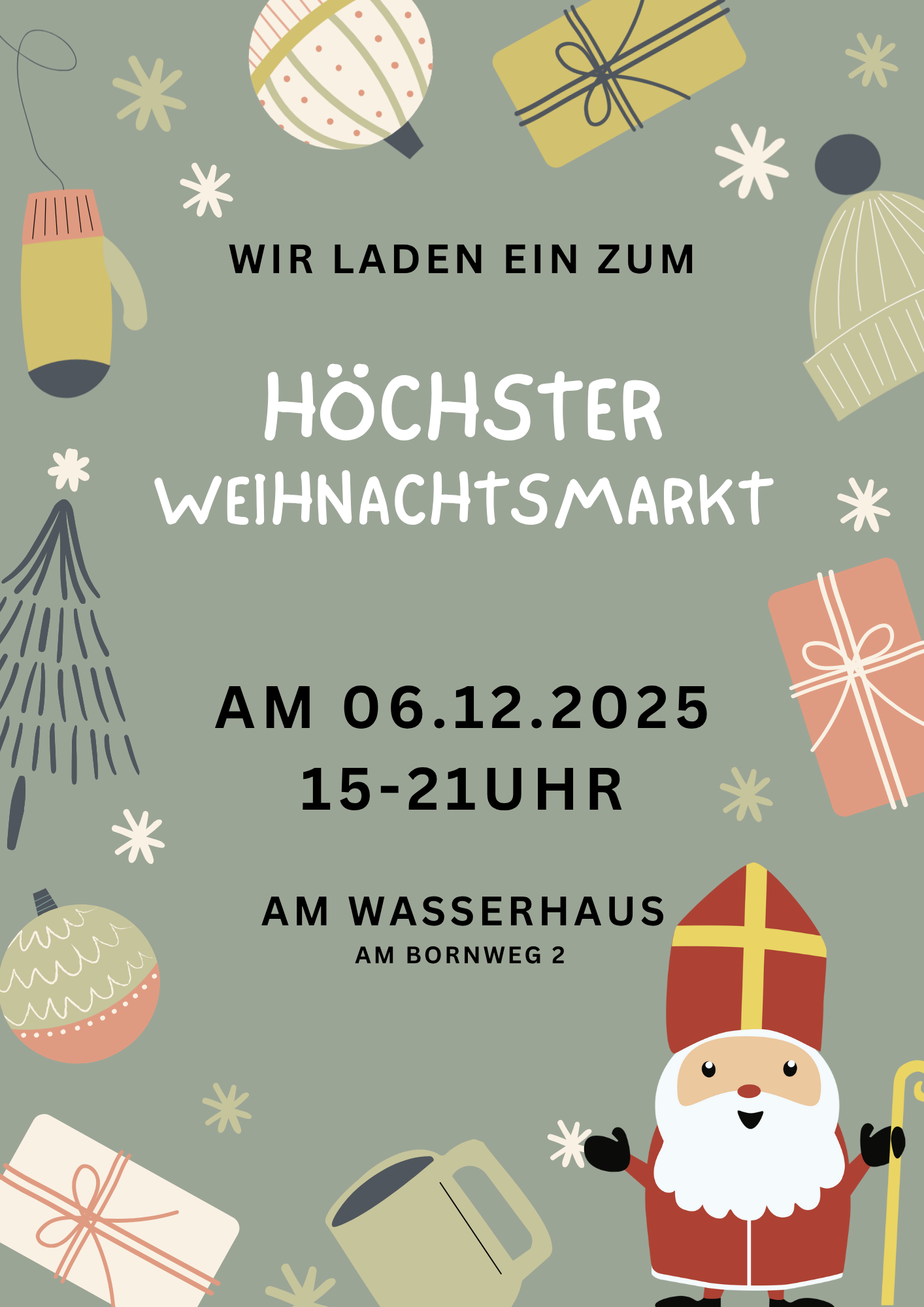 Der Weihnachtsmarkt findet in Höchst an der Nidder in diesem Jahr in etwas anderer Atmosphäre statt. Das Wasserhaus und die nahe Umgebung wird dazu am Samstag, den 6. Dezember 2025 von 15 bis 21 Uhr weihnachtlich erleuchtet. Verschiedene Ortsvereine präsentieren ein vielfältiges kulinarisches Angebot. Leckere Lachs-, Bismarck- und Backfischbrötchen bereiten die Angler zu, beim VfB Höchst kann man gegrillte Bratwurst und herzhafte Wildbratwurst im Brötchen verzehren. Köstliche selbstgebackene Waffeln mit verschiedenen Toppings werden vom Förderverein der Kita Höchst angeboten. Pommes und Süßkartoffelpommes mit Joppi-Sauce oder traditionell rot/weiß und knuspriges Popcorn bietet der Förderverein der Karoline- von- Günderrode- Schule an. Hier gibt es auch den Teig für die Stockbrote zu erwerben, die dann gemütlich am Feuer gebacken werden können. Verschiedene Getränkespezialitäten, ob heiß oder kalt, ob mit oder ohne Alkohol runden das gesamte Angebot ab, lassen Sie sich überraschen. Weitere Aussteller bereichern mit ihren Geschenkideen die anliegende Straße, die sich in ein zauberhaftes Weihnachtsdorf verwandelt. Weitere Angebote für Groß und Klein erwarten die Besucher, unter anderem ein Wanderfamiliengottesdienst von der ev. Kirche zum Weihnachtsmarkt und eine Fackelwanderung vom Förderverein der Schule bei Einbruch der Dunkelheit. Selbstverständlich wird auch der Nikolaus, gestellt von der Theatergruppe des Kultursports, in dem wunderschönen Ambiente erscheinen. (Wer für ein Kind ein Geschenk bringen lassen möchte, gibt dieses bitte am Tag der Veranstaltung zwischen 14 und 16 Uhr am Stand von der Kita „Die kleinen Strolche“ oder beim „Förderverein der Karoline von Günderrode Schule“ ab. Der Posaunenchor der SELK-Kirche unter der Leitung von Andrea Schima wird den Weihnachtsmarkt um 18 Uhr in weihnachtlichen Weisen erklingen lassen. Den Abschluss des offiziellen Programms bildet das gemeinsame Rudelsingen unter Begleitung vom Posaunenchor.
