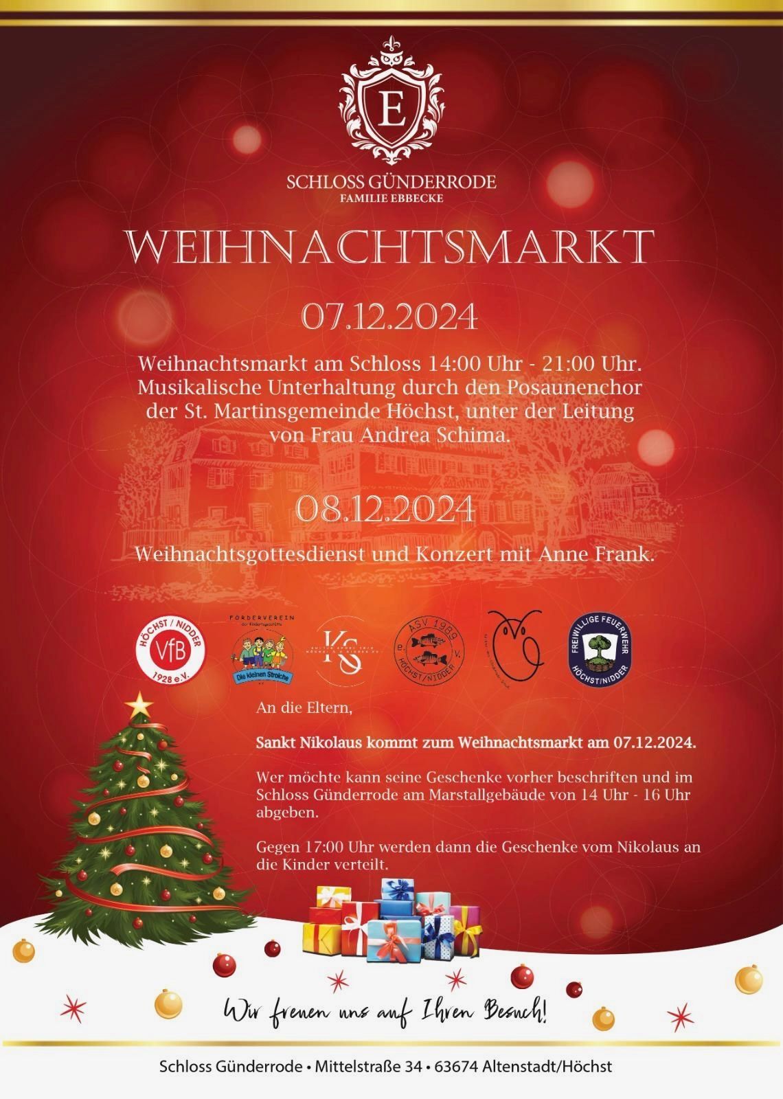 Ein Highlight für die Kleinen: Der Nikolaus kommt mit seinem Gefolge, um Weihnachtsstimmung und Geschenke zu bringen! 🎅 Eltern und Großeltern können hierfür am Veranstaltungstag von 14 bis 16 Uhr Geschenke im Marstallgebäude des Schloss Günderrode abgeben.